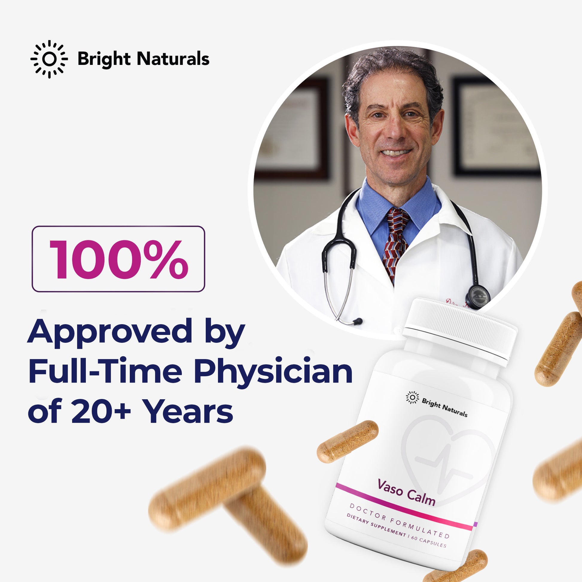 Our breakthrough dietary supplement offers natural support for blood pressure and heart health maintenance. Expertly formulated by the team of functional medicine professionals at Bright Naturals, Vaso Calm leverages the latest advancements in cardiovascular research.†*