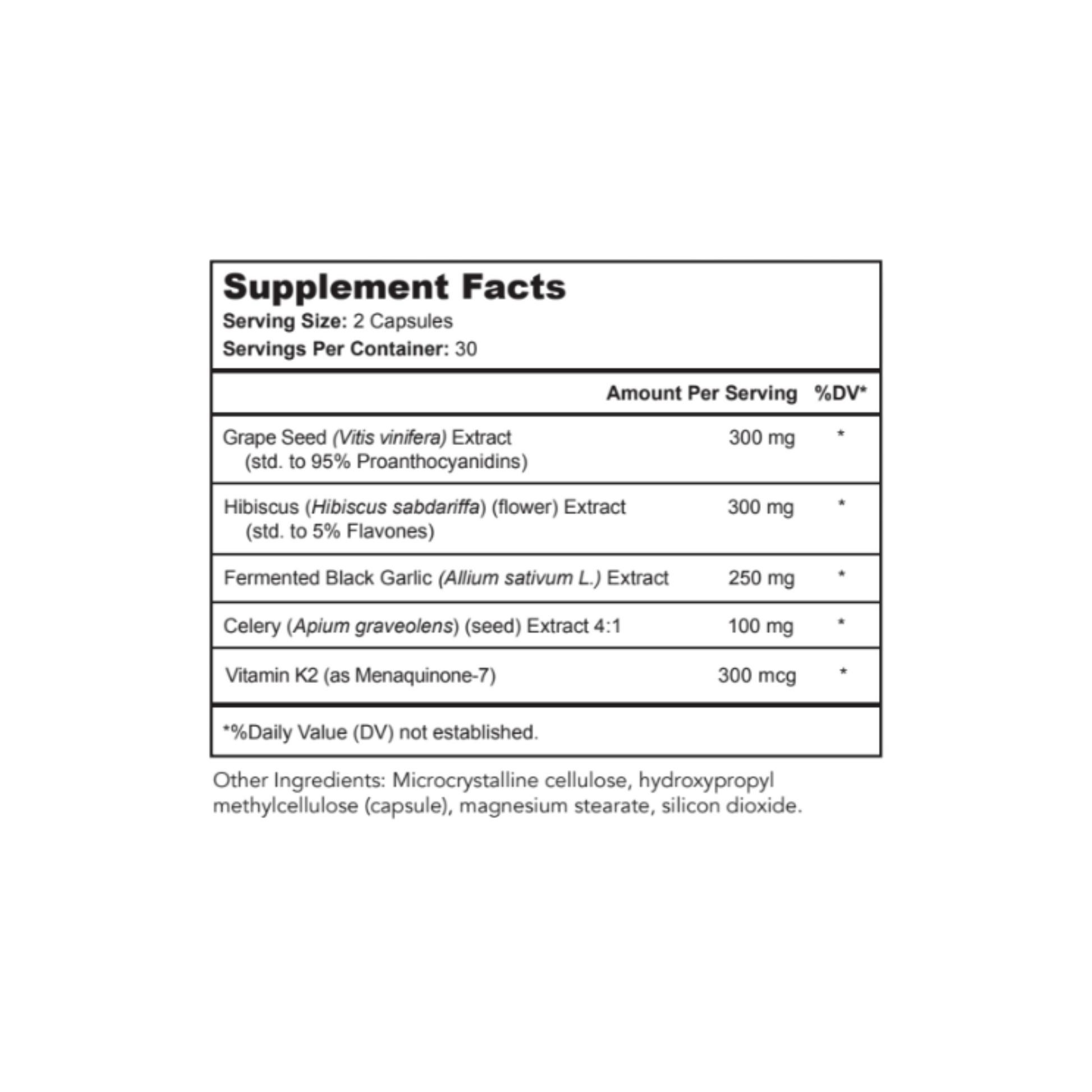 Our unique blood support supplement features Fermented Garlic, Celery Seed Extract, Grape Seed Extract, and Hibiscus Flower extract, as well as a superior form of Vitamin K known as menaquinone-7 (MK-7), making it an excellent choice for those seeking full-spectrum cardiovascular health support.*