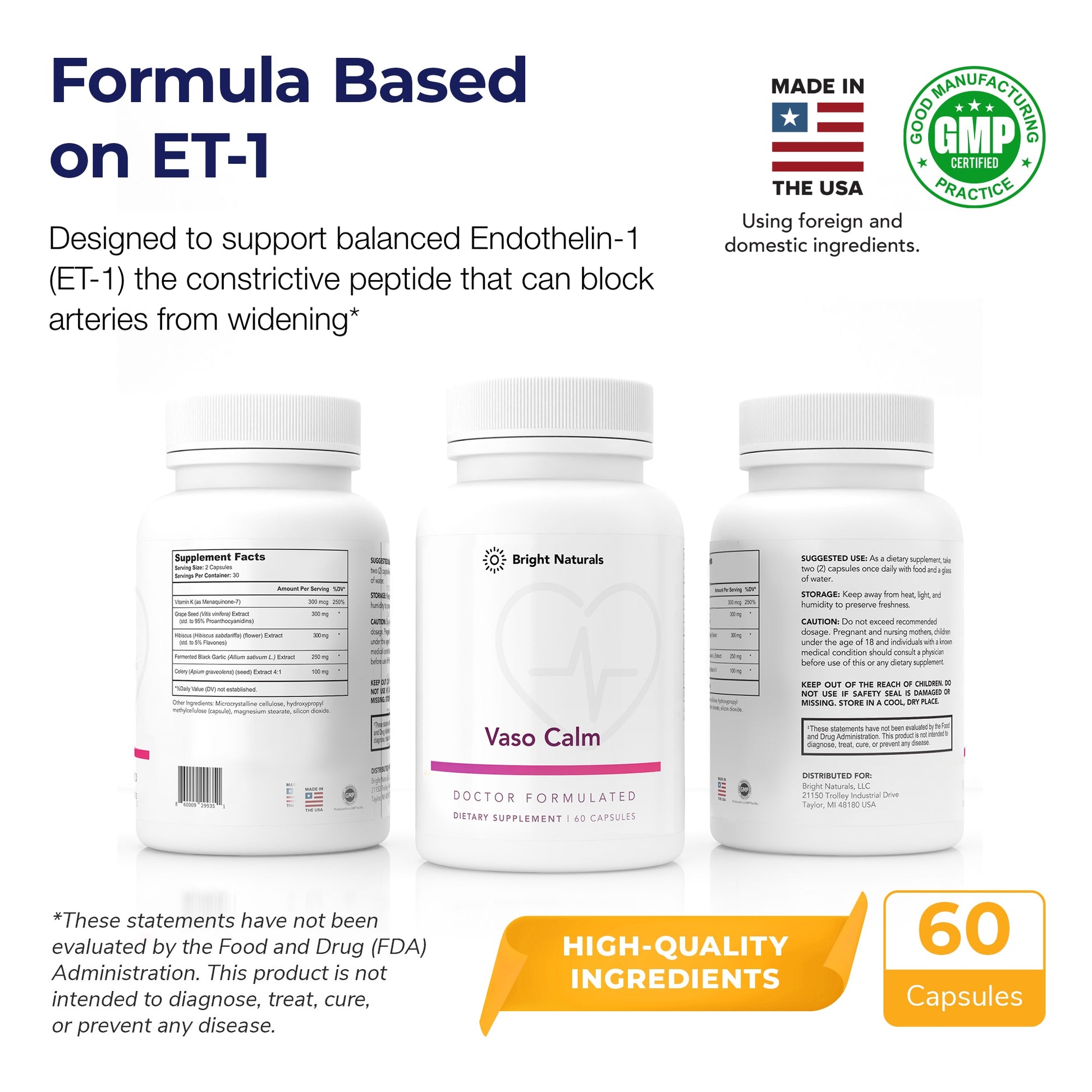 Understanding how ET-1 influences vascular health has allowed Bright Naturals to develop a formula that targets this little-known factor in blood pressure regulation. Vaso Calm is designed to promote long-term heart health and circulation.†*
